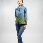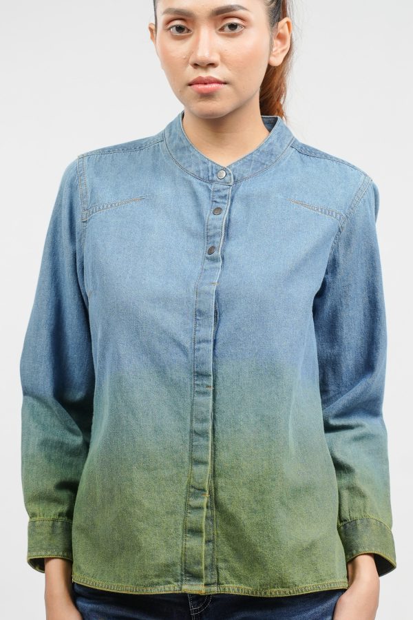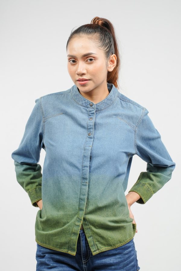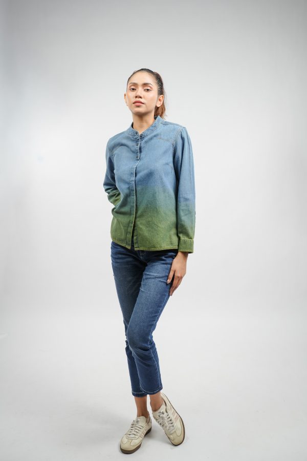 The Indigo Dip-Dyed Denim Shirt. Crafted from 100% cotton light indigo denim, it delivers a refined yet modern look with its striking bicolour finish. Featuring a Japanese band collar and clean hidden placket, it’s tailored for effortless sophistication and all-day comfort.
