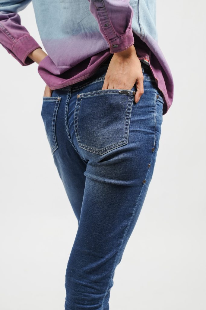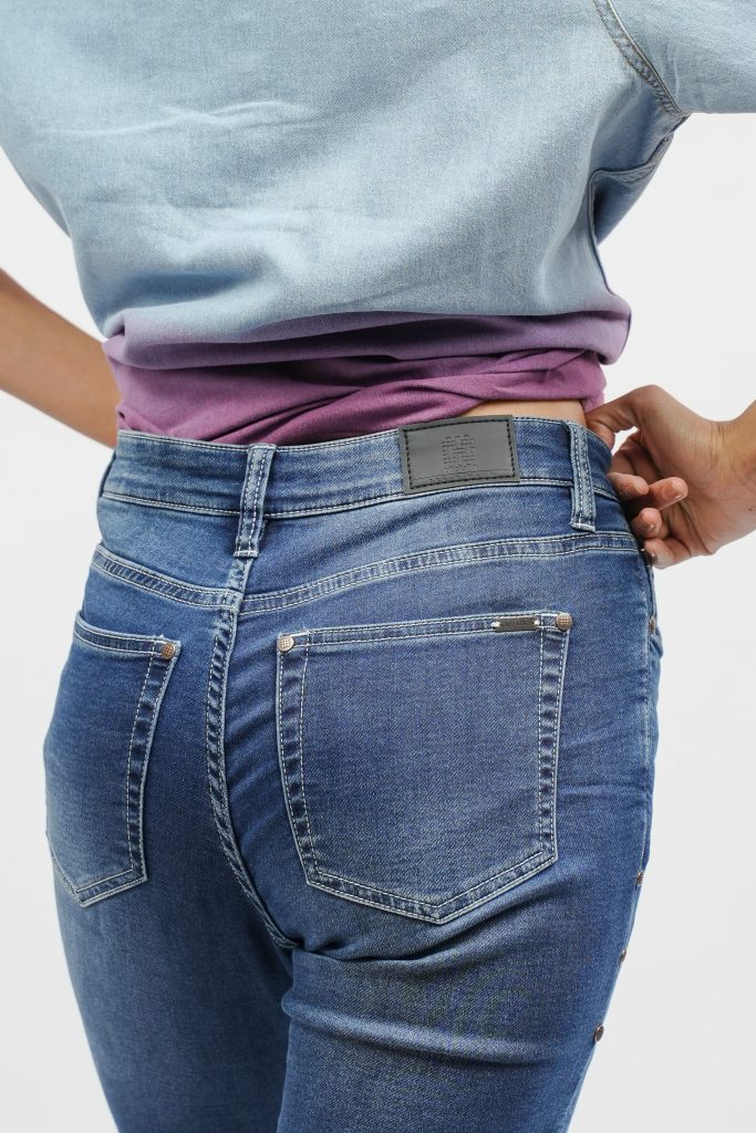 • Embellishments: Branded metal shank button on the waistband closure, metal rivets over the side seams & pockets, and metal bar over the  right back pocket