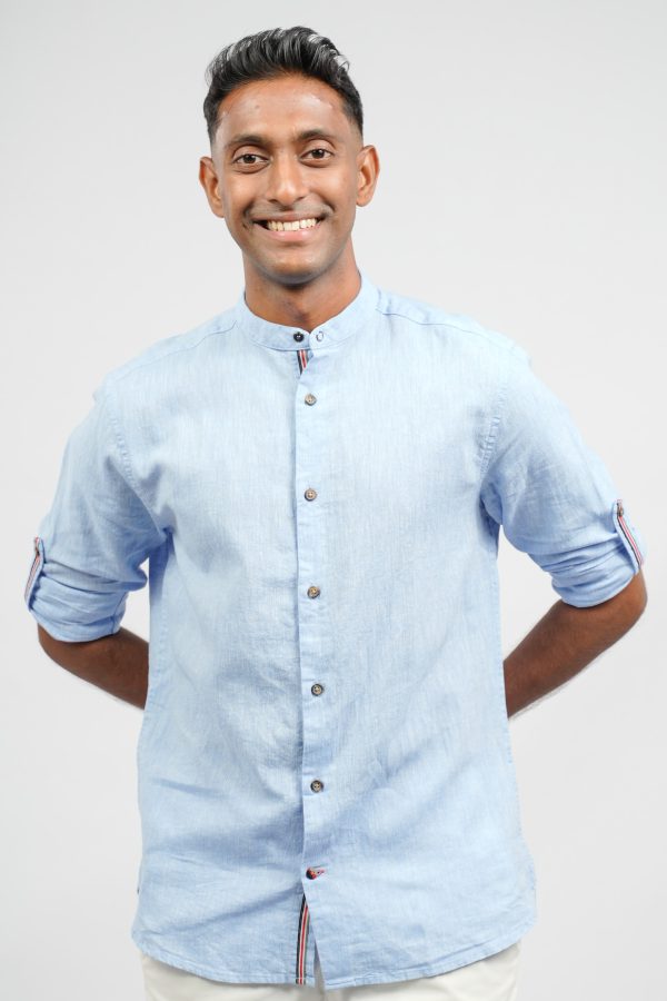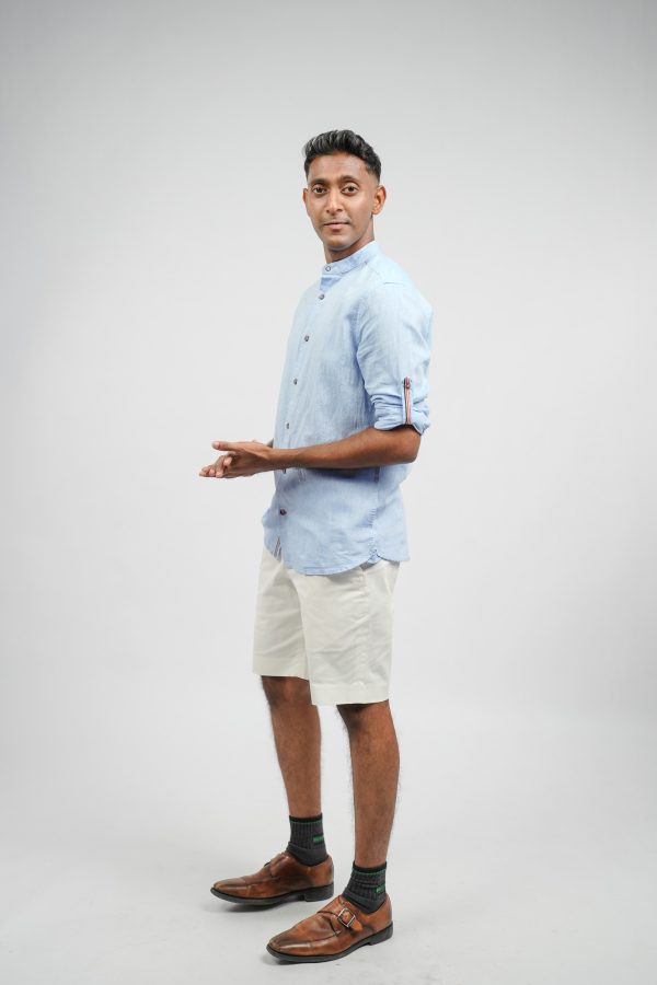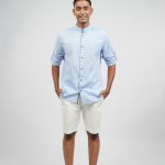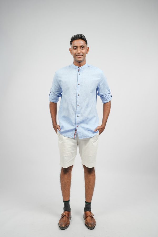 Stay cool and look casual in this soft shirt. Tailored in a modern slim fit, the linen-cotton blend is lightweight and boasts quick dry properties, making it essential for street wear comfort. Complete with a modern band collar and turn-up sleeves, it will give you a stylish look.